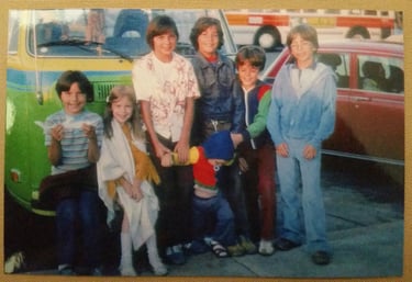 Me and my siblings (and the rainbow VW Van), circa 1977
